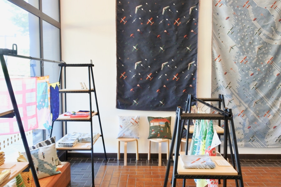 “テキスタイル”とは織物、布地のこと。お店の壁には3mと3.5mの生地をどーん!と展示。水色と紺色の大きな生地は、空に飛行機やパラグライダー、傘、トビウオが飛んでいる「SKY」という名前のテキスタイル。